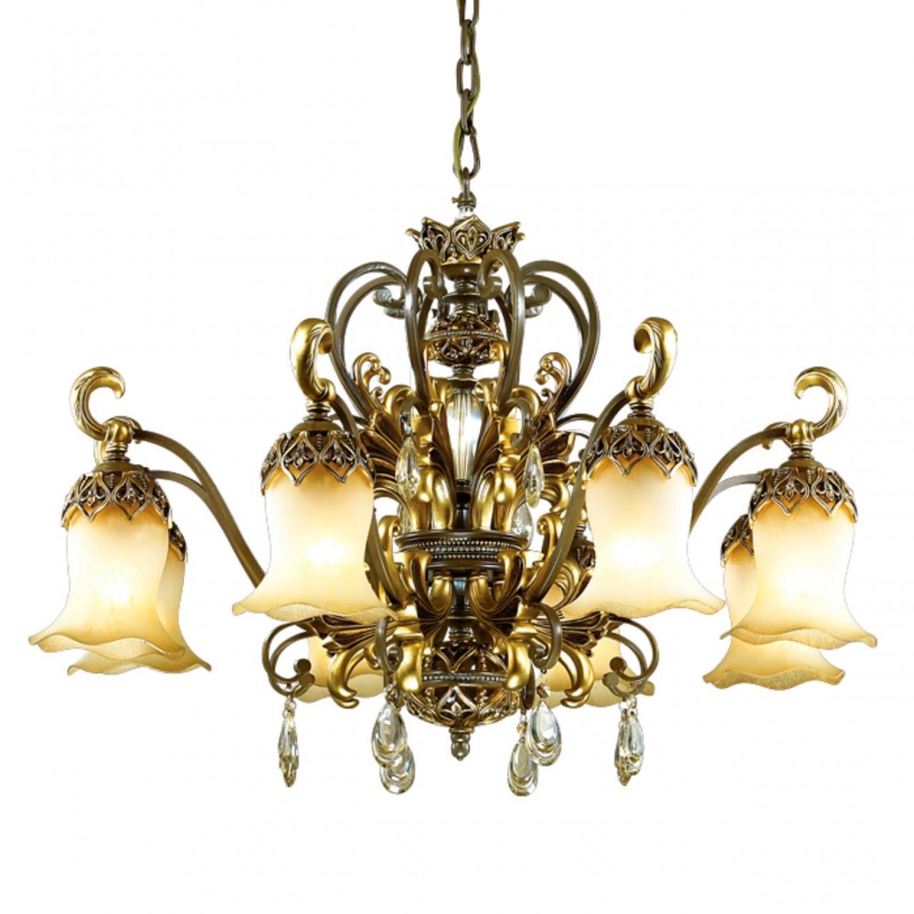 Люстра 2802/8 линии Safira роскошна в каждом декоративном элементе. Богатство и изящество лепных элементов, украшающих основание, резных розеток, которыми обрамлены фигурные плафоны из матового стекла, переливающийся хрусталь, а также благородный цвет античной бронзы и золота - все это делает люстру необычайно величественной, изысканной и роскошной. Цоколь E27. Мощность 8*60W. Нет ламп в комплекте.