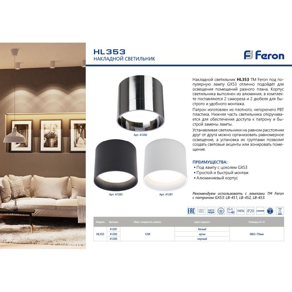 Накладной светильник HL353 TM Feron под популярную лампу GX53 отлично подойдёт для освещения помещений разного плана. Корпус светильника выполнен из алюминия, в комплекте поставляются 2 самореза и 2 дюбеля для быстрого и удобного монтажа. Патрон изготовлен из плотного, негорючего PBT пластика. Нижняя часть светильника откручивается для обеспечения доступа к патрону и быстрой замены лампы. Устанавливая светильники на равном расстоянии друг от друга можно организовать равномерное освещение, а установка их группами позволит создать световые акценты или зонировать помещение.