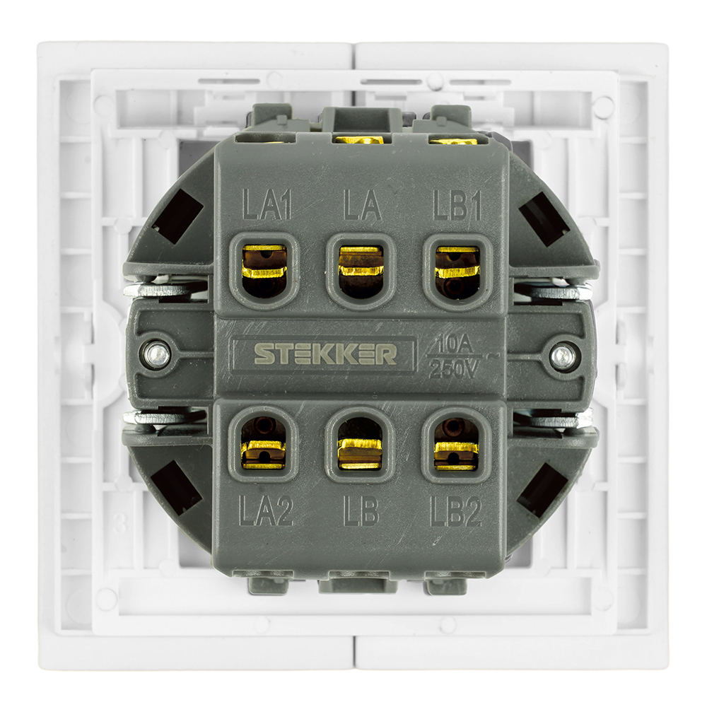 Выключатель двухклавишный STEKKER RSW10-3107-01, серия Мия тип установки - скрытый, размер изделия 71*71*41,5мм., цвет белая магнолия, материал изделия поликарбонат, латунь, сталь. Номинальное напряжение 250 , номинальный ток 10А, 20