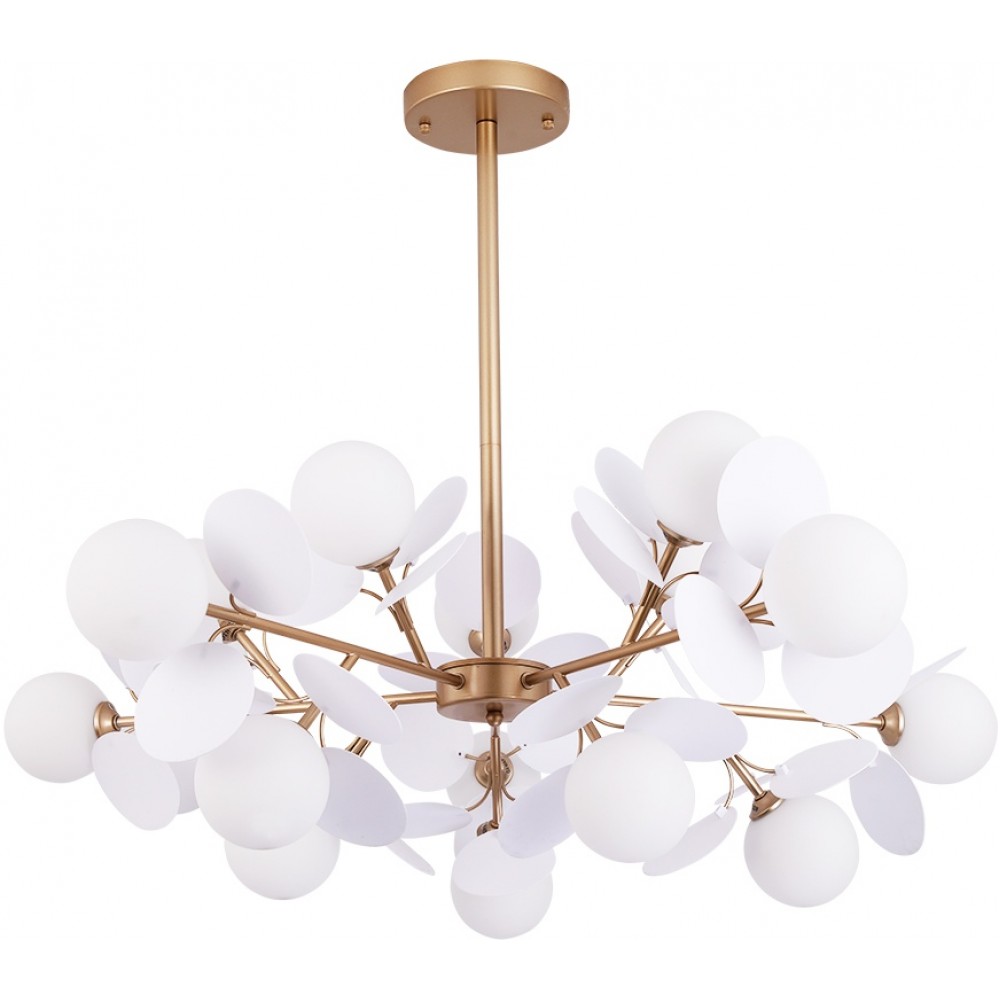 Потолочная люстра на штанге Peacock A1369SP-15SG от итальянской фабрики Arte Lamp подходит для размещения в гостиной, в кафе, в спальне, на кухне, в магазине, в стиле модерн. Материал изготовления – металл, цвет белый. Модель имеет 15 плафонов (стекло). Цоколь 15xG9. Освещаемая площадь до 6 кв. м. Мощность 600 W, питание от сети 220 V, cтепень защиты от влаги и пыли IP20. Габариты: длина – 95 см, ширина – 95 см, высота – 33 см, диаметр – 95 см, крепление на монтажную пластину.