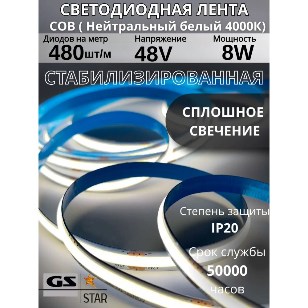Светодиодная лента СОВ (СТАБИЛИЗИРОВАННАЯ) GS star IP20 480 шт/м 8w 48v нейтральный белый (20 метров катушка) CRI>90 800 lm/m 8 мм. Цена указана за 1 метр.