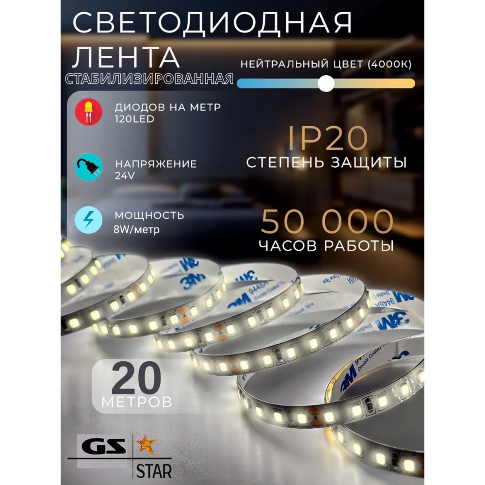 Светодиодная лента (СТАБИЛИЗИРОВАННАЯ) GS star 2835 120LED IP20 CRI85 нейтральный белый 8W (20м). Цена указана за 1 метр.