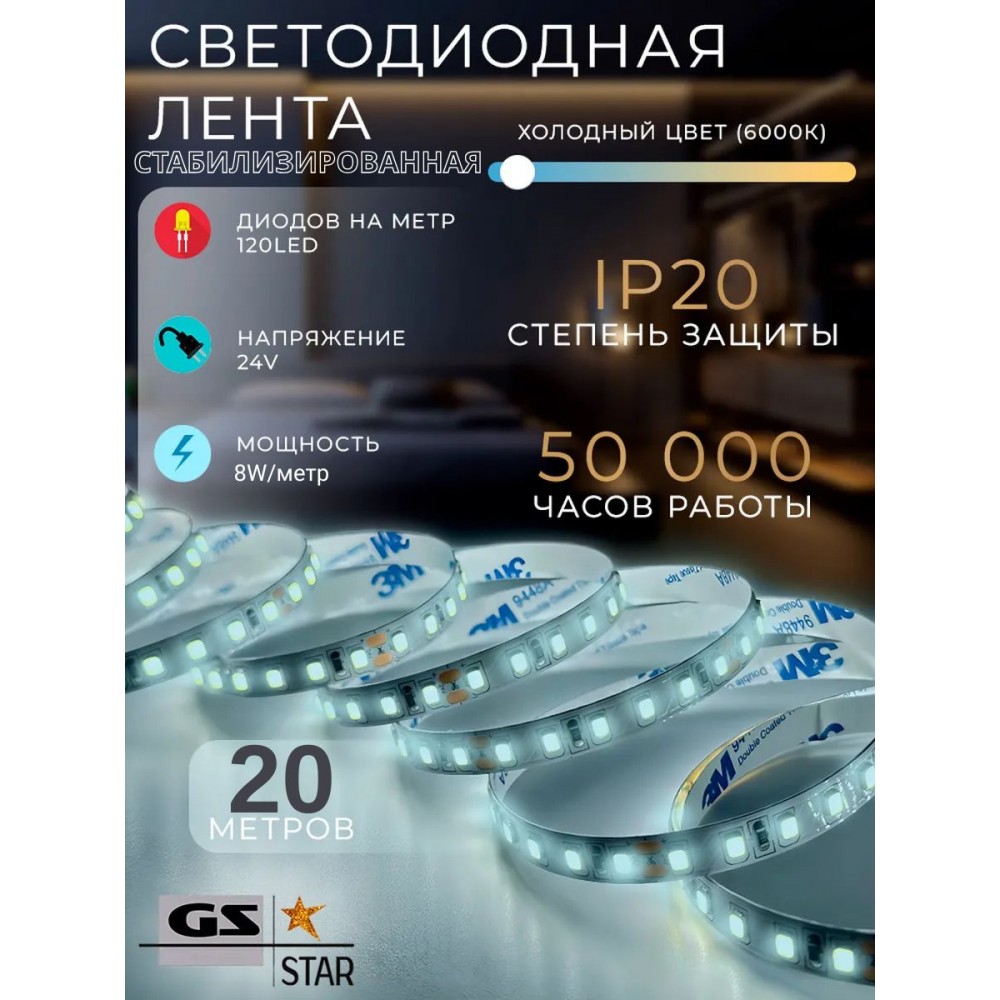Светодиодная лента (СТАБИЛИЗИРОВАННАЯ) GS star 2835 120LED IP20 CRI85 Холодный белый 10W (20м). Цена указана за 1 метр.