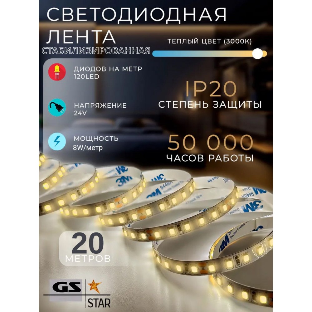 Светодиодная лента (СТАБИЛИЗИРОВАННАЯ) GS star 2835 120LED IP20 CRI85 Тёплый белый 10W (20м). Цена указана за 1 метр.