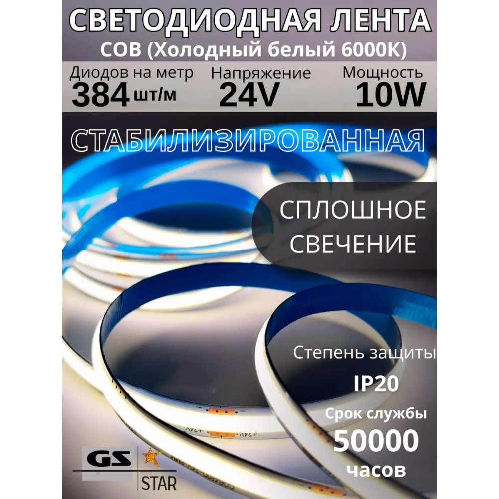 Светодиодная лента СОВ (СТАБИЛИЗИРОВАННАЯ) GS star IP20 384 шт/м 10w 24v холодный белый (10 метров катушка) CRI 90 800 lm/m 8 мм. Цена указана за 1 метр.