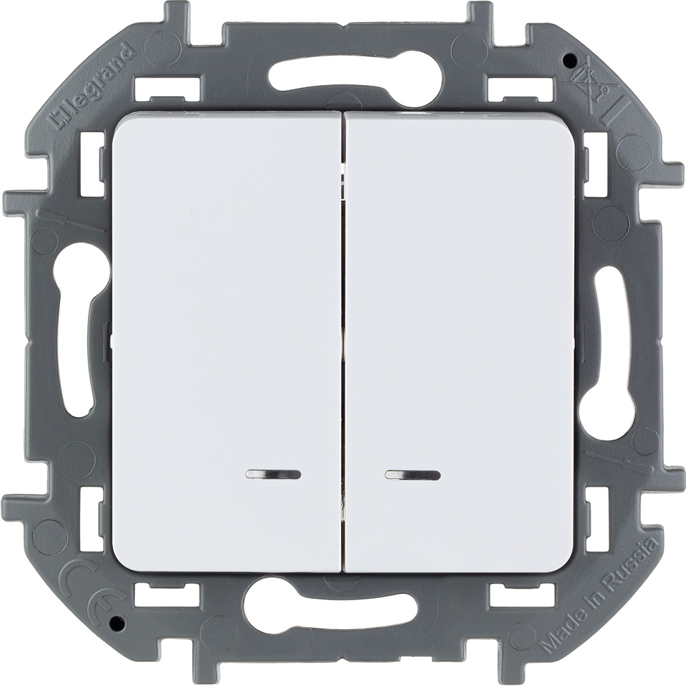 Выключатель двухклавишный с подсветкой/индикацией Legrand Inspiria для скрытого монтажа, цвет "Белый", номинальный ток 10 А, напряжение ~250В. Предназначен для установки в электрических сетях жилых и общественных зданий и используется для управления приборами освещения, вентиляции и т.д. Используется для независимой коммутации двух нагрузок с одного места. Оснащен двумя светодиодными лампами для подсветки или индикации. Особенности изделия: - Компактный механизм с глубиной всего 20 мм. комфортно размещается в различных монтажных коробках. - Материал клавиш - глянцевый пластик АБС, стоек к выгоранию и загрязнениям. - Все токоведущие части выключателя имеют защиту от случайного прикосновения. - Безвинтовые зажимы для присоединения проводов обеспечивают быстрое подключение и отключение, гарантируют надежное и долговечное соеднинение и не требуют обслуживания. - Удобные широкие толкатели облегчают работу по демонтажу провода. - Улучшенная эргономика снижает вероятность искрения при коммутации светодиодов. - Ход к