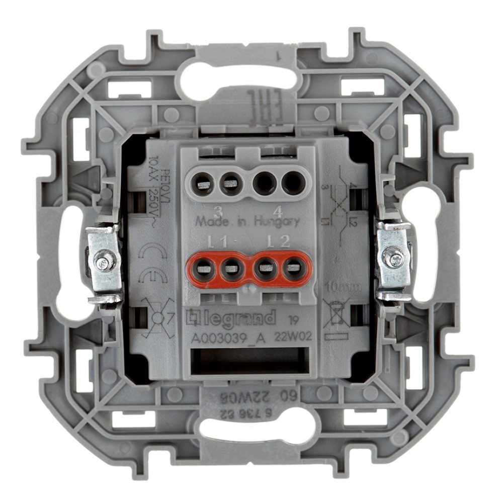 Переключатель промежуточный одноклавишный Legrand Inspiria для скрытого монтажа, цвет "Алюминий", номинальный ток 10 А, напряжение ~250В. Предназначен для установки в электрических сетях жилых и общественных зданий и используется для управления приборами освещения, вентиляции и т.д. Используется для управления нагрузкой с трех или более мест.Особенности изделия: - Компактный механизм с глубиной всего 20 мм. комфортно размещается в различных монтажных коробках. - Материал клавиши - глянцевый пластик АБС, стоек к выгоранию и загрязнениям. - Все токоведущие части выключателя имеют защиту от случайного прикосновения. - Для подсоединения проводов используются винтовые зажимы. - Улучшенная эргономика снижает вероятность искрения при коммутации светодиодов. - Ход клавиши короткий, не громкий.