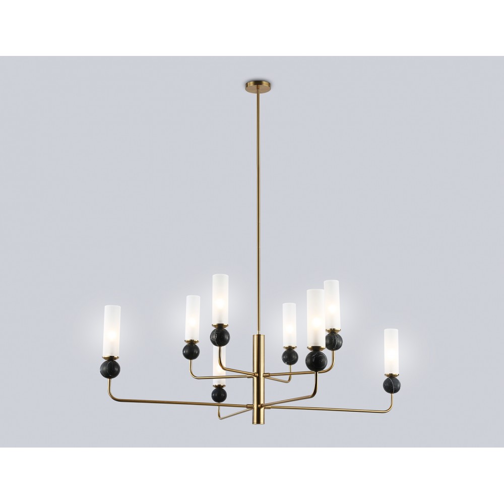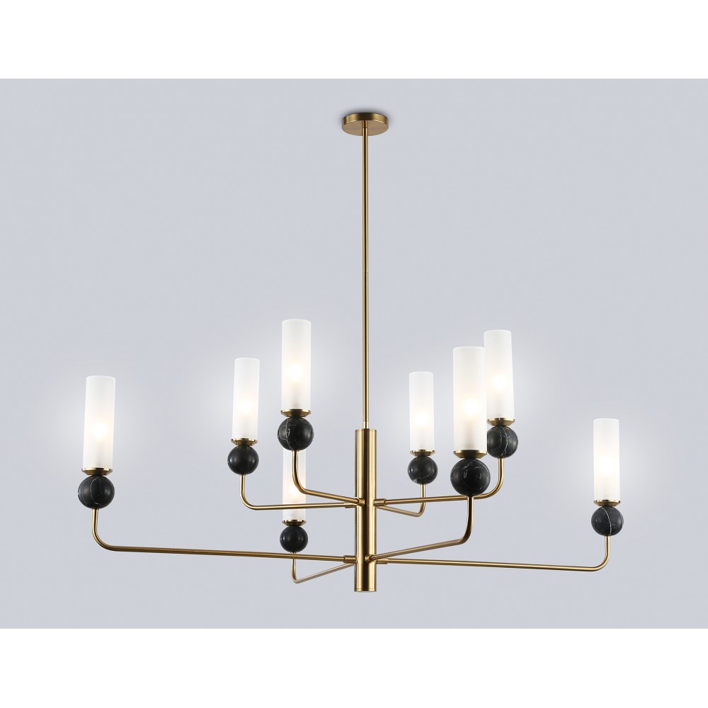 Люстра на штанге с мрамором из коллекции HIGH LIGHT. Модель LH53264 представлена в современном стиле модерн. Люстра выполнена из металлического каркаса цвета латунь, стеклянных плафонов белого цвета и декорирована элементами из мрамора черного цвета. Для данной модели подойдут лампы с цоколем Е14. Люстра будет прекрасным дополнением в любом помещении.
