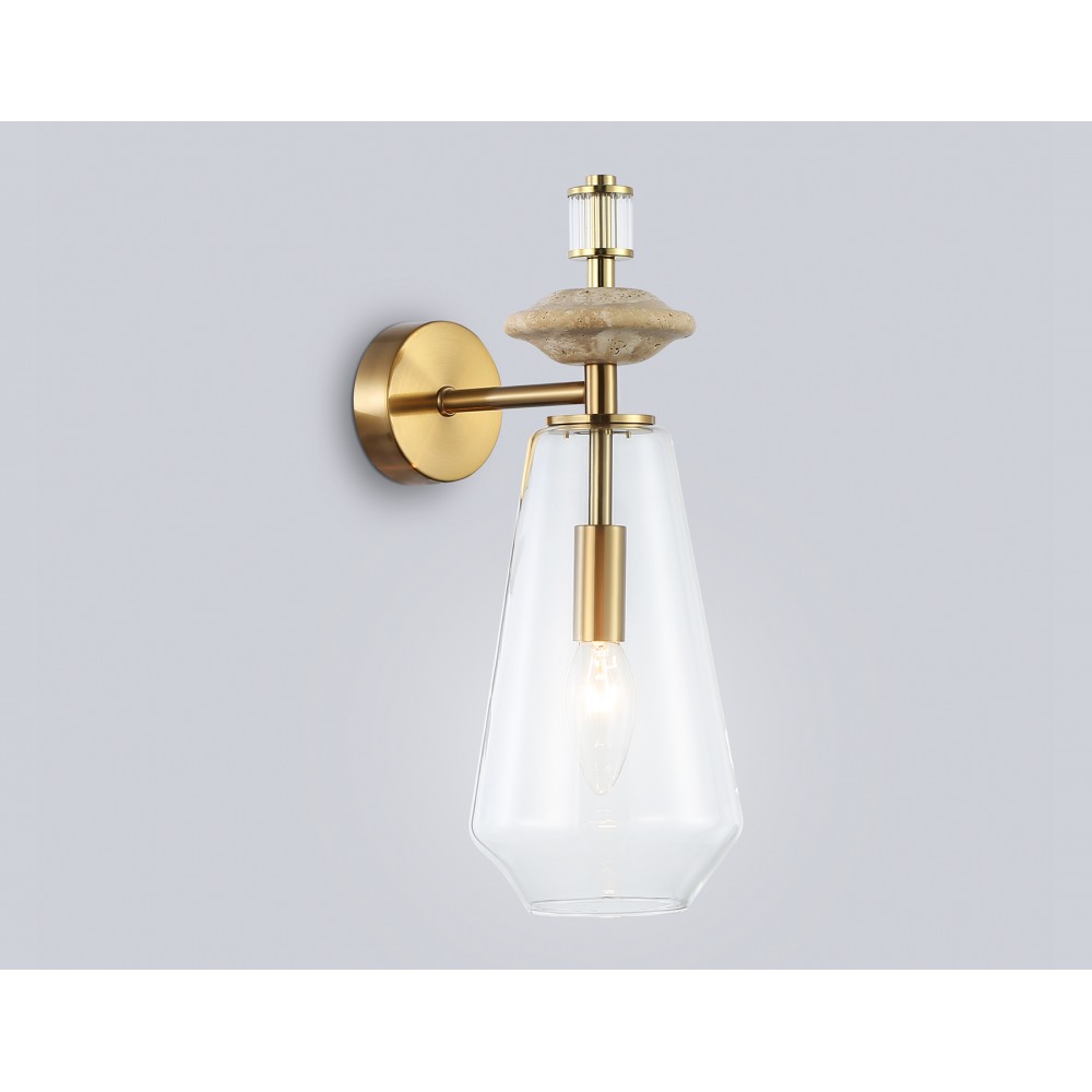 Настенный светильник с травертином из коллекции HIGH LIGHT. Модель LH53307 представлена в стиле неоклассика. Светильник выполнен из металлического каркаса цвета латунь, стеклянного плафона и декорирован элементами из травертина. Для данной модели подойдет сменная лампа с цоколем Е14. Светильник будет прекрасным дополнением в любом помещении.