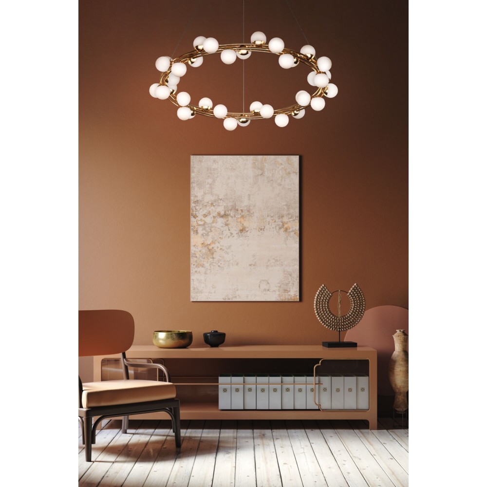 Широкая окружность, обрамленная «молекулами» света,обеспечивает максимально равномерное и яркое освещениепространства. «Атомный» или «молекулярный» дизайн,отражающий естество и природную сущность каждого предмета,не теряет актуальности и позволяет выгодно расставлять акцентыв интерьере. Одна из характерных черт подобных светильников—невесомость конструкции. За счет тонких, практически невидимыхтросов, которые регулируются по высоте, создается ощущение, что люстра парит в воздухе. Металлическая золотая арматура и матово-белые миниатюрные плафоны с легкостью дополнят любую палитру, а представленные в коллекции подвесная люстра и бра станут готовым ансамблем для освещения гостиной, спальни, прихожей.