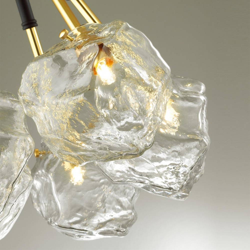 Линия Stono - потрясающие дизайнерские модели, воплощающие несколько стилей. Например, стиль Bionica, характеризующийся природными естественными формами и цветами. Продолговатый , вытянутый вверх силуэт люстры подчеркивает мотивы американского стиля. Сочетание черного и золотого присуще стилю Ардеко. Стеклянные плафоны светильника просто завораживают своей необычной формой, естественные шероховатые грани которого особенно будут эффектно смотреться при включенным свете.