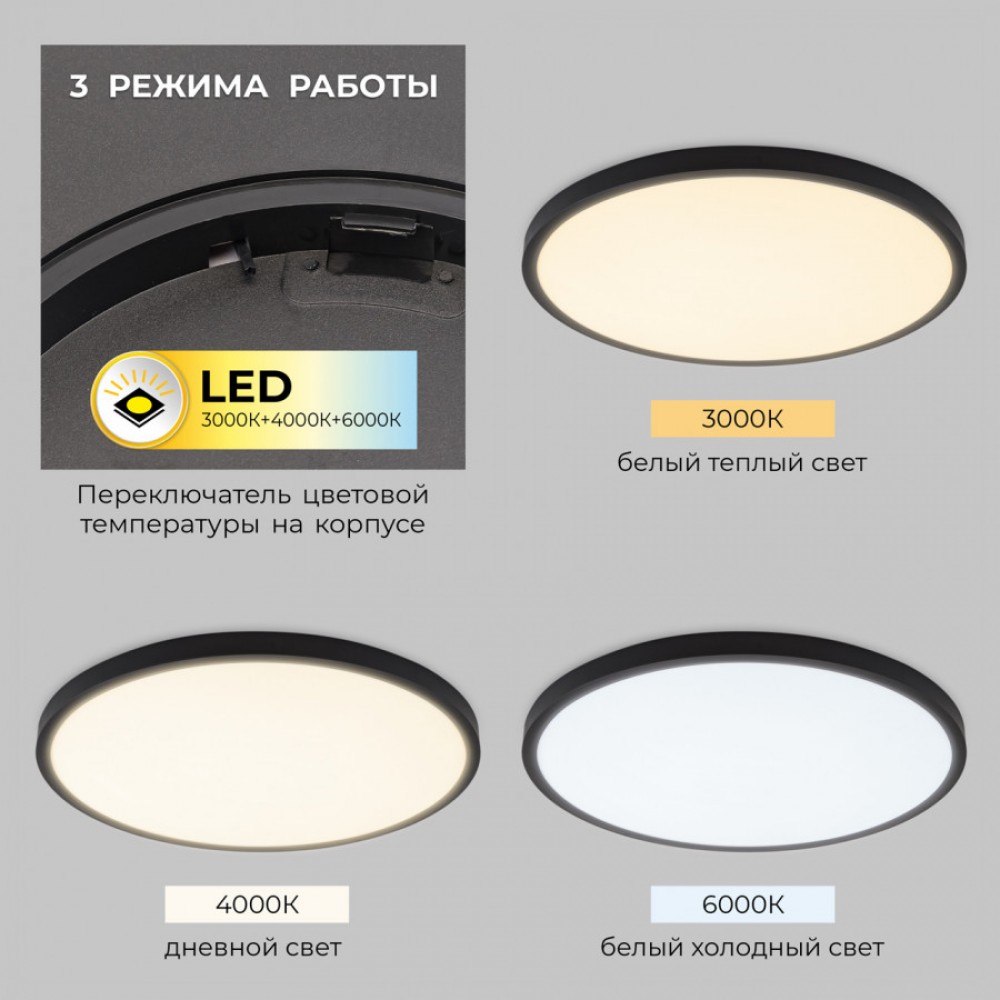 Производитель: IMEX. Цвет основного света: 3000+4200+6500К Белый теплый+дневной+белый холодный. Стиль: ТЕХНО. Место расположения: кухня, прихожая, гостиная, детская, спальня, кафе, ресторан, для больших помещений, магазин. Тип управления: Выключатель. Индекс цветопередачи Ra>: 80. Габариты упаковки - длина, мм: 510. Габариты упаковки - ширина, мм: 30. Габариты упаковки - высота, мм: 510. Световой поток, Лм: 3200. Напряжение, V: 220V. Тип светодиодов основного света: SMD. Мощность общая, Вт: 40. Материал базы: Пластик. Угол свечения, Град: 120. Материал плафона: Пластик. Тип крепления: Планка. Диаметр, мм: 500. Высота, мм: 25. Серия: RONDA. Цвет базы: Черный. Степень IP: 20.