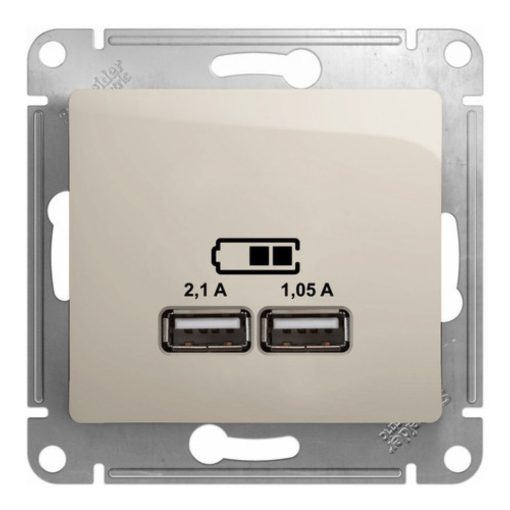 Механизм Schneider Electric Glossa (цвет молочный) розетки с двумя разъёмами USB с выходными напряжением 5 В постоянного тока и выходами с номинальным током по 2,1 А.- Предназначен для зарядки мобильных устройств: телефоны, планшетные компьютеры, mp3/mp4 плееры.- Может заряжать одно или два устройства одновременно.- Выполнен из материала PС+ASA, стойкого к УФ-излучению и появлению царапин.
