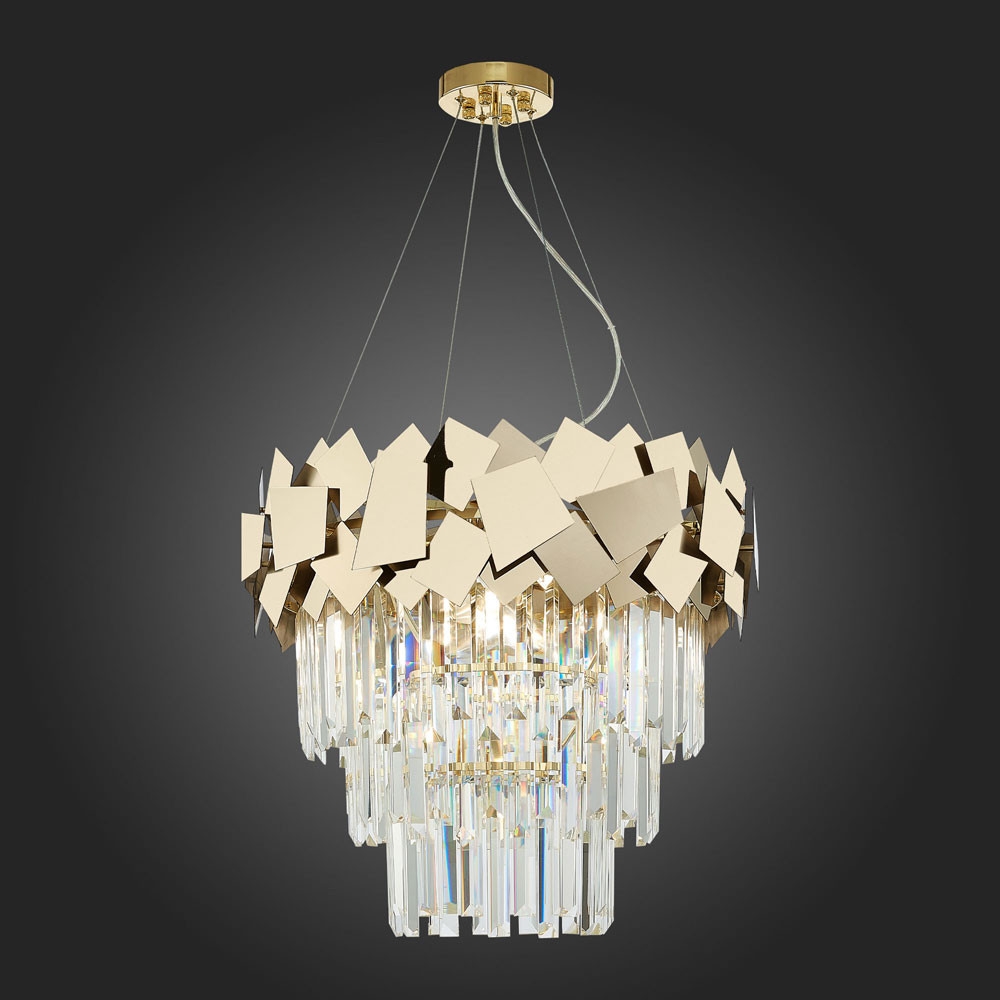 Подвесная люстра хрустальная каскадная Caserta SL1232.203.06 от итальянской фабрики ST Luce украсит гостиную, спальню, кухню, кабинет в стиле модерн. Материал — металл, цвет золото. Плафон из хрусталя с цоколем 6xE14 и максимальной мощностью 360W освещает площадь до 18 кв. м. Питание от сети 220V. Технические особенности: доступно подключение диммера. Устанавливается на пластину. Габариты: высота — 62 см, диаметр — 48 см, длина подвеса — 192 см.